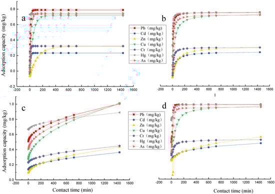 The adsorption capacities of heavy metals on the soil sample dramatically increased with increasing contact time (Figure 5). When the adsorption capacity reached a certain value, it weakly increased or decreased with increasing contact time. The adsorption rate of the soil material can reach 50% in 5 min, 80% in 15 min, 95% in 90 min and 99% after 720 min. The adsorption process of heavy metals by the soil sample was mainly concentrated in the first 90 min, and the subsequent adsorption was relatively slow. The reason for this difference may be physical adsorption (fast adsorption stage) and chemical adsorption (slow adsorption stage). Generally, physical adsorption can achieve local equilibrium in a few milliseconds to a few seconds; however, chemical adsorption requires a certain activation energy to adsorb, resulting in a slow adsorption process.