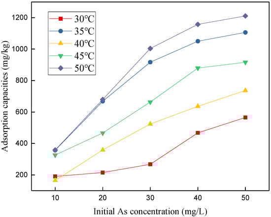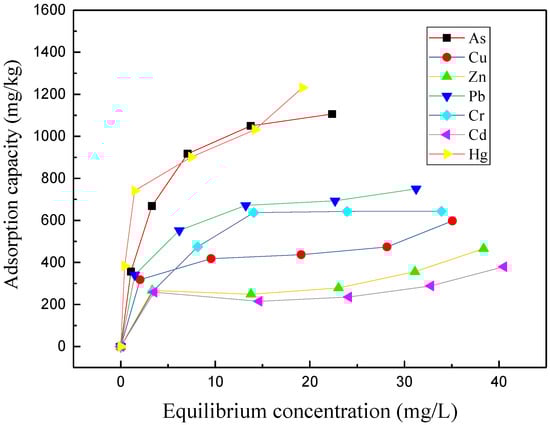 The shape and change rule of the adsorption isotherm can be used to understand the action intensity of the adsorbate and adsorbent, the state of the adsorbate on the interface and the structure of the adsorption layer. All heavy metals exhibit a larger slope at a lower equilibrium concentration (the heavy metal concentration which was no longer improved after the different initial concentrations of heavy metals adsorbed by the soil sample) (Figure 6). The adsorption capacities of heavy metals were added with increasing initial heavy metal concentrations; however, the slope of the isotherm adsorption curve was gentle at higher equilibrium concentrations. The slope of As was the largest, followed by those of Hg, Cr and Pb, which were dramatically adsorbed and then slowly adsorbed. The slopes of Cu, Zn and Cd slowly increased with increasing initial concentration. The reason may be that the concentration of adsorbate in the solution was enhanced with increasing initial concentration, which was more favorable for the combination with adsorbate and adsorbent. However, the capacity of each heavy metal combined with the soil material was different since these heavy metals had different properties. Hence, the maximum adsorption capacity of each heavy metal has a higher difference, of which As was the most obvious with the increase in initial As concentration. In this study, As was selected for specific discussion due to its sensitivity to the initial concentration of heavy metals in soil sample (Figure 7).