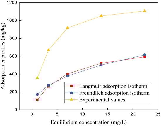 Figure 8 shows the Langmuir and Freundlich isotherm model fitting of As adsorption on lime soil. The isotherm adsorption parameters obtained by the fitting are shown in Table 4. The correlation coefficients (R2) of the Langmuir and Freundlich models were 0.817 and 0.920, respectively, which implied that the Freundlich model can better describe the adsorption process of As on lime soil. In addition, the k and n values of the Freundlich model were 166 L/mg and 2.37.