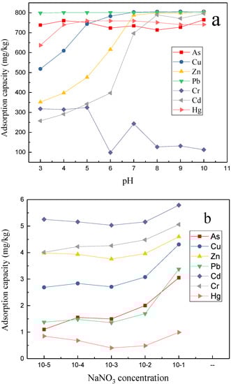 Adsorption capacities of heavy metals adsorbed on the soil at different pH values (a) and NaNO3 concentrations (b).