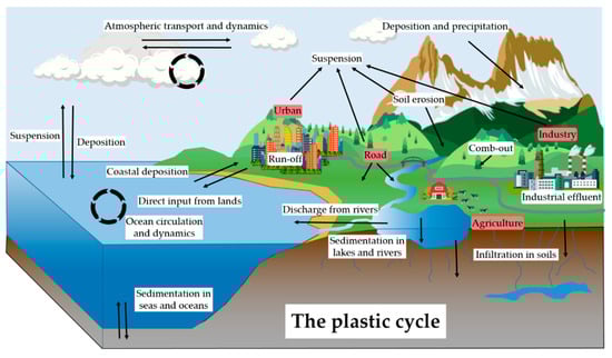 The boundaries between compartments are thus blurred and permeable, the occurrence and abundance of MP and NP depend on the interactions and connections with the adjacent environments. Therefore, Horton and Dixon [25] and Bank and Hansson [26] have introduced the concept of “Plastic Cycle” to indicate the biogeochemical cycle of plastics between environmental compartments and stressing the global nature of this ubiquitous problem [26]. However, in the “Plastic Cycle” model the fate and transport of plastic only include the transfer from lands to oceans, considering mainly a unidirectional flow. The “Plastic Cycle” model is mainly developed for large plastic debris (meso- and macroplastics). Therefore, it does not consider the possible transfer from seas to soils and, most importantly, it does not evaluate the atmospheric transport, which could be relevant for MP and NP. Atmospheric transport of MP is poorly understood, but recent studies have shown that it is likely to be a crucial transport pathway [33,34,35]. Even less is known about transport and sources of NP; however, due to their small size it is plausible to assume that NP could derive from similar sources compared to MP, and that atmospheric transport of NP may be comparable to MP transport. Atmospheric dynamics include suspension, transport and deposition of MP and NP. The main sources are urban, industrial and agricultural activities [21,22,36,37] and traffic [38,39,40], while secondary sources, like erosion of contaminated soils [41] and suspension of MP from the ocean during bubble bursting [42], should also be taken into account. Figure 1 reports the main sources and transport pathways of MP and NP. Once in the atmosphere, plastic particles are transported following air masses movements [17,43] and could act as ice nuclei, facilitating the formation of ice crystals [44]. The atmospheric oxidant capacity probably has a key role in their transformation, since MP and NP are exposed to sunlight [45], gas-phase oxidants (ozone, hydroxyl and nitrate radicals) [46,47,48,49] and aqueous phase oxidants (hydroxyl and nitrate radicals) [50] with higher concentrations compared to soil and water bodies. However, little is known about the fate and transformation of MP in the atmosphere. MP and NP shape and dimensions influence their deposition, and therefore their residence time in the atmosphere. The deposition is potentially accelerated by scavenging such as precipitations [33,34] and comb-out effect [30].