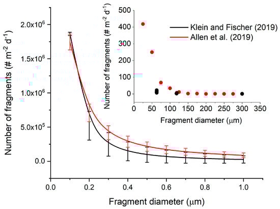 The works from Allen et al. [33] and Klein and Fischer [30] report the number of fragments deposed (# m−2 d−1) as a function of the size of the fragments. They both observed that the number of fragments increased as the size decreased. The insert in Figure 2 shows the data reported in the two studies: we have fitted both datasets using the power law equation y = axb, where y is the number of particles deposed (# m−2 d−1) and x is the size (µm). The parameters a and b obtained are reported in Table 3.