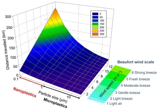 The settling velocity is thus proportional to the size and the density of the particle. Considering a spherical particle (Cd = 0.47) of PS, with ρs = 1060 kg m−3, suspended in air (ρ = 1.225 kg m−3 at 15 °C), applying Equation (6) we can easily calculate the settling velocity vs. as a function of the diameter d. In the absence of vertical uplift and turbulence, the PS particle falls down. If we consider the time needed to descend by 1 km and we consider a constant horizontal wind, we can have a brief look at the distance travelled by the particle as a function of its size. Figure 3 reports the simulation for PS particles of different diameters, in the range of MP and NP, in the presence of horizontal wind between 1 (light air in the Beaufort scale) and 13 m s−1 (strong breeze). It is clear that smaller particles are transported for longer distances and fresh breeze is able to transport particles with diameter of 100 nm for 200 km. Polymers with lower density compared to PS (for example PE and PP) could even be transported for longer distances. This is only a simplified schema that does not take into account the vertical uplift of air masses and the gust speed. However, these calculations provide a first approximation on travelling distances of NP and MP in the atmosphere and could contribute to an assessment of the importance of atmospheric transport of NP.