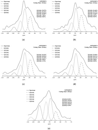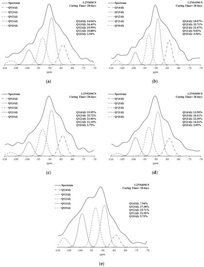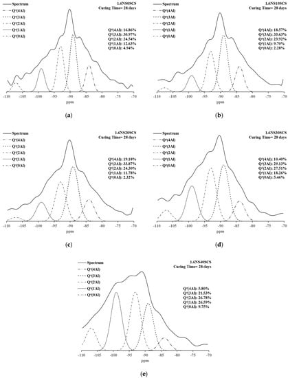 | Samples | Curing Time | Silicate Derivatives (%) | Deconvoluted Fractions of Silicon Centers (%) | ||||||