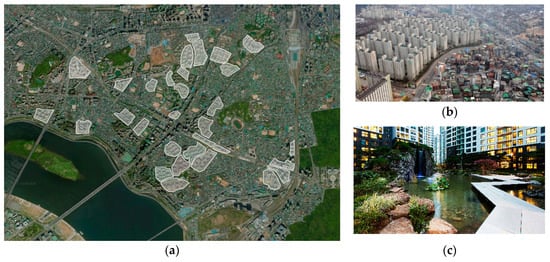 (a) Development of an apartment complex in Seoul. (b) Newly developed apartment complex and traditional fine-grained neighborhoods []. (c) Inside area of an apartment complex [].