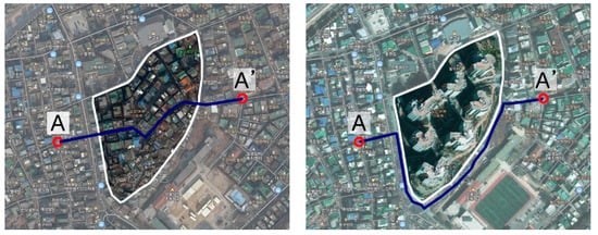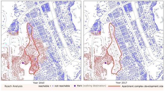 Figure 6 shows the visualization of reach for the destination of park in the case 1 (Bomun Park AC). In this visualization, it is seen that a number of buildings on the right side of the apartment complex are becoming unreachable for the nearby park destination after the development of the apartment complex. The long form of Bomun Park AC (case 1) stays as a barrier between the neighborhood and the destination.