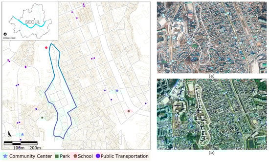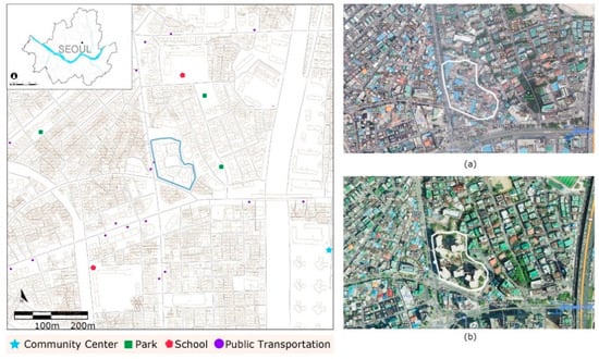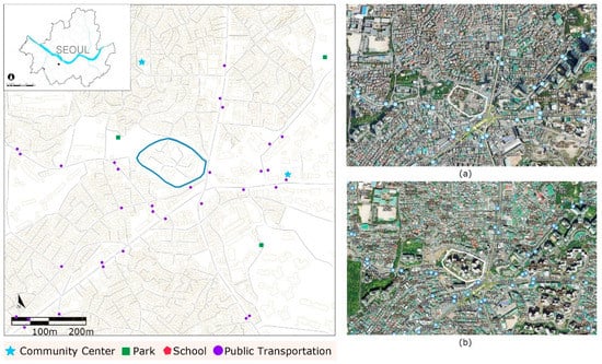 Apartment complexes are very common types of residence in Seoul, Korea. Apartments account for nearly half of total residential types in cities. According to data from the 2018 Housing Survey, apartments accounted for 49.2% (42.2% of housing types in the city of Seoul) of all housing types in Korea []. Apartments allow more efficient use of development sites by accommodating a greater population per unit area than any other type of residence. In addition, many Korean people prefer to live in apartment complexes because of high levels of privacy and security in comparison to other types of housing. Despite the many advantages of apartments, however, the construction of large apartment complexes is criticized for reducing the continuity and accessibility of urban spaces by strictly restricting the inflow of cars and pedestrians due to partial or fully privatized networks.