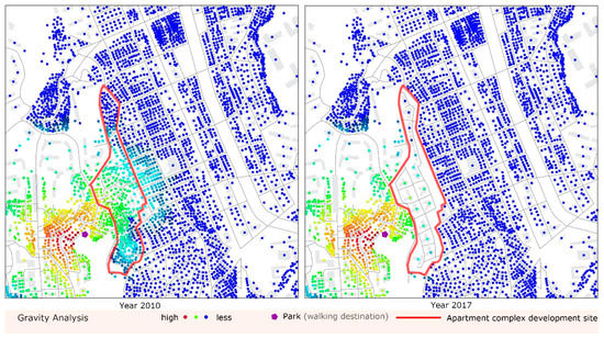 In Figure 7, gravity analysis of the case 1 (Bomun Park AC) is exhibited. The colors on the right side of the apartment development site are changing from green to blue, which can be interpreted as a sign of worsening accessibility to the park.