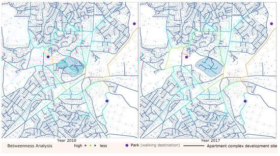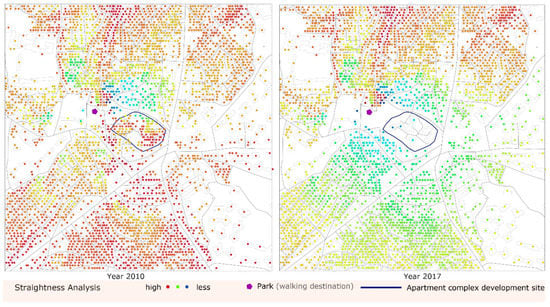 A decrease in the measures of gravity and reach means an increased time required to arrive at destinations. With some exceptional cases, the longer it takes to arrive at a destination, the less favorable the environment is for walking []. Thus, we can say walkability is worsened by apartment complex development because of the deterioration of accessibility. Second, a decrease in the measure of straightness does not necessarily mean a decrease in walking intentions on the part of pedestrians. For transportation purposes, the shortest path (representing the straightness measure) is always desirable. In some conditions of walking for recreation, however, curving and/or non-linear paths are more desirable [].