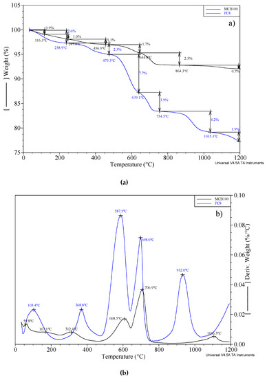 MCB100 and PC8 samples were analyzed by TGA to estimate the percentage of the aforementioned mineralogical phases. Moreover, TGA results were compared with those XRF results. The TGA experiment results and the corresponding derivative weight are shown in Figure 2, where blue and black lines are referred to as PC8 and MCB100 in the manuscript online version, respectively.