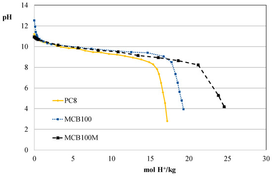 Some of the alkali species contained in the LG-MgO upon contact with water would establish a solubility equilibrium resulting in their corresponding hydroxide. Thus, depending on the type of LG-MgO, the composition of the oxides could vary as well as their mineralogical phases, affecting the ANC curves results. In order to explain these pieces of evidence, three phases of the ANC curves and the equilibrium established in each of the samples are described [25]. The different ANC curves for the three types of LG-MgO under study are shown in Figure 3 and, for all the samples under study, the first phase was considered in a pH range between 12 and 10.5, the second phase was identified by a pH stabilization between 10.5 and 8.5 in a wide range of acid additions, and finally, the third phase was considered from 8.5 < pH < 4.