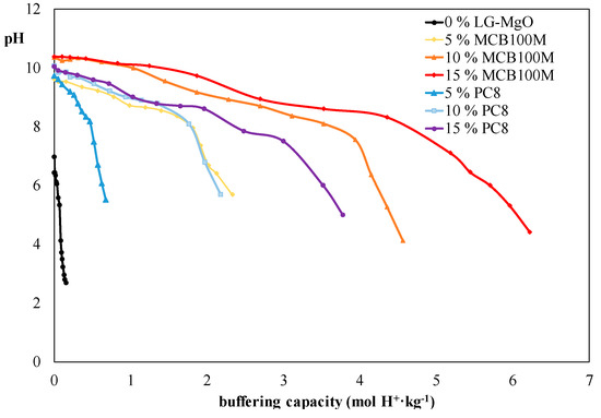Against the above background, the effectiveness of LG-MgO as a stabilizing agent in contaminated soils containing pH-dependent metal(loid)s can be established based on its reactivity and its behavior across the whole pH range [25]. Both chemical properties are directly related to their specific surface area and particle size distribution [26]. While the reactivity of magnesium (hydr)oxide is usually determined using the citric acid test (CAT), measuring the time needed to neutralize this weak acid [27], the acid neutralization capacity (ANC) test [28] allows measuring the buffering capacity and determines the ability to maintain a stable pH range.