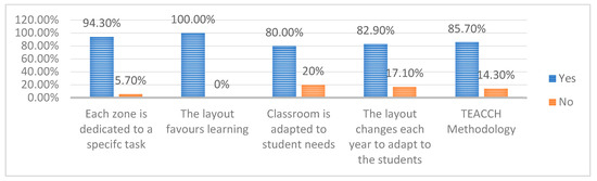 The data related to the physical organisation of the ASD classroom is presented below, taking into account aspects such as distribution and organisation of the ASD classroom, with designated zones for each task or using resources and methodologies to facilitate the teaching-learning process. As shown in Figure 1, the percentage of centres which meet the required criteria is also shown. Thus, we see that 94.3% of ASD classrooms are organised into work zones, each for a different specific task. This corresponds to the TEACCH methodology, used by 85.70% of ASD classrooms. All teachers claimed that this distribution is effective in fomenting learning although only 80% reported that their classroom is adapted to the real needs of their students. A similar percentage (82.9%) reported changing the distribution of the classroom every year according to the profile of the students.
