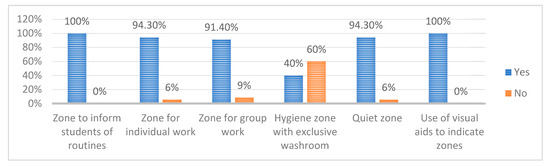 In Figure 2, we can see how ASD classrooms are divided into a series of specific zones: to inform (100% of classrooms), individual work (94.3%), group work (91.4%) and a quiet zone (94.3%). Some 60% admit they lack exclusive washroom area for personal hygiene. Additionally, all classrooms use visual aids, such as pictograms, to indicate the distribution of the spaces.