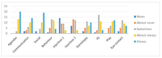 As we can see in Figure 3, the students of ASD classrooms generally have social impairments, communication difficulties or behavioural disorders. Some 57.1% require a constant daily routine or agenda, while support for communication, either through augmentative and alternative communication (AAC) systems or visual aids, is generalised for 40% of students. Some 82.9% of students always or almost always have social impairments. Additionally, some (31.4%) display stereotypic behaviour, such as hand washing, flapping, object alignment, rocking or unintentional vocalisations. Regarding behavioural problems, 34.4% of students have behavioural problems in two or more environments; however, 40% are never self-injurious (self-harm) and 20% never display aggression or harm others. Symbolic play deficits are very frequent or constant (65.7%), and the absence of eye contact is occasional (34.3%). A total of 48.6% of the ASD professionals report their students have a low intelligence quotient (IQ) for their age.