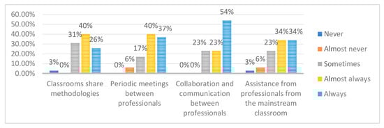 As shown in Figure 5, some 54% of ASD classroom professionals report having constant communication and collaboration with the mainstream classroom teacher, almost always through periodic meetings (40%). Additionally, 40% almost always share classroom methodologies, with only 2.9% not doing so. Of respondents, 68.6% regarded this collaboration between professionals as positive. According to the Chi-square test, we can establish a significant relation between collaboration and assistance between professionals and the regularly held meetings (χ2 (6) = 19, 1, p < 0.05), the collaboration increases when periodic meetings are held. Furthermore, there is also a significant relation between this collaboration among professionals and the continuity of methodologies (χ2 (6) = 12, 7, p < 0.05), the methodologies are shared when there is fluid and constant collaboration.