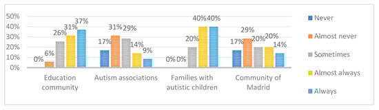 In this variable, the collaboration and assistance in the classrooms are analysed taking into account the institutional support from the school, autism associations, families or the Community of Madrid. Thus, as it is shown in Figure 6, ASD classrooms positively rate the collaboration of the educational community, 37.1% receiving continuous assistance. However, 5.7% report receiving no assistance from the school. Regarding the autism associations, 28.6% receive sporadic assistance, while 31.4% report they almost never receive assistance. The evaluation of these associations is generally negative. On the other hand, families of ASD students always or almost always collaborate with classroom professionals (80%), closely involving themselves in their children’s education. Finally, the Community of Madrid received the most negative evaluations; some 35.7% of teachers report they never or almost never receive assistance from the Community.