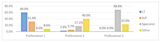 Figure 7 analyses the professionals assigned to each ASD classroom taking into account their professional profile and the level of satisfaction with the training received in university for teaching in an ASD classroom environment in a professional capacity. According to Figure 7, ASD classrooms are generally staffed by two education professionals. The first is generally specialised in learning therapy (LT) (60%) or speech-language pathology (SLP) (31.4%). The second member of the team is generally a trained education specialist (68.6%), although some have training in LT (2.9%), SLP (5.7%) and others in psycho-pedagogy or counselling (22.9%).