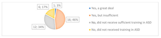 Fifthly, with regards to the training of ASD classroom professionals, 51% do not have a positive rating for the training received in University for the performance of their classroom work. Many authors [50,51] report similar findings, indicating that “only a few teachers acquired the necessary skills during their university education, those with the most positive attitude”. Establishing a significant relation, we can see that ASD professionals of classrooms created since 2015 received better training than those with longer years in the profession, possibly the consequence of improved university training in this field. Furthermore, many ASD classrooms demand more specific guidelines for the functions and training of ASD professionals, who generally do not have the necessary training and their working hours are not clearly established. The findings show that newly created ASD classrooms (2018) more closely comply with established guidelines, either due to the training received or because they informed themselves independently. However, ASD classrooms created in 2019 did not receive training in this area, perhaps due to the current difficult situation caused by the COVID-19 virus or lack of time.