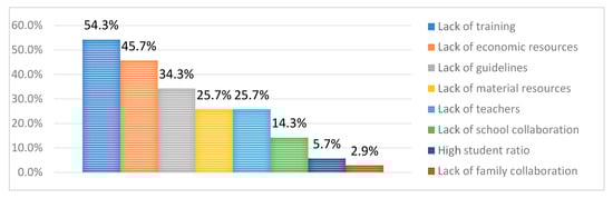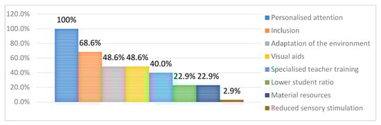 Regarding the shortcomings, Figure 11 shows that ASD classroom professionals highlighted the lack of specialised training (54.3%) both for ASD classroom teachers and for the rest of the educational community. Furthermore, 45.7% point to a lack of financial resources and 25.7% to the lack of material resources. Notably, 34.3% of these professionals request clear and precise guidelines and more teachers in ASD classrooms (25.7%).
