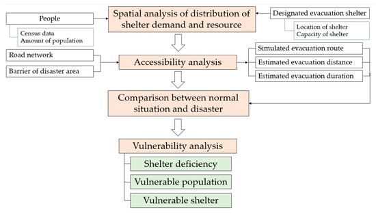 Our assumption is that vulnerability during a disaster is caused by the spatial heterogeneity of the imbalance between demand and capacity resources, which could be concealed in summarized statistics and due to limited accessibility. To examine this hypothesis, we structured the method as follows (Figure 1): (1) analysis of the spatial distribution of shelter planning resources and population to assess the spatial availability of shelters; (2) estimation of the accessibility based on the spatial availability and distribution; (3) estimation of the shelter demand to assess the shelter deficiency based on the spatial accessibility of the normal situation as compared with the disaster situation; and (4) analysis of the vulnerability of the evacuation shelters in terms of vulnerability reduction in disaster preparedness and management. We describe the details of the methodology in the following sections.