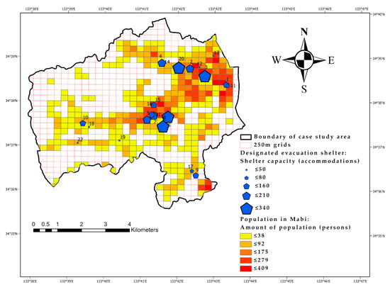 The census data were merged with areas with the same key code into a 250 m polygon mesh grid layer. Using the Mabi town boundary layer, this grid layer was clipped and joined with the Mabi town feature layer. Within these total grid areas, 337 grids contained a population of at least one resident. The rest (413 grid areas or 45% of the study area) comprised zero population data, which were areas in which mountains, roads, lakes, or rivers were located, as shown in Figure 3.