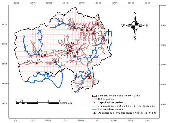 Spatial distribution of the population points and designated evacuation shelters in Mabi and the evacuation routes.