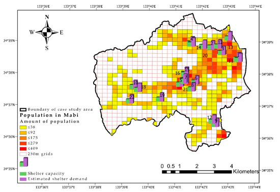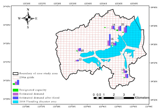 Furthermore, Table 6 presents the remaining capacity of 10 evacuation shelters after flooding, and shows that capacity was reduced to 1340 (43.86% of the total capacity in Mabi). The demand ratio for accessibility to six of these shelters was significantly increased (shelter Numbers 2, 10, 15, 16, 20, and 22), and they were located near the flooding area (Figure 8). The contrast between the estimated demand and the estimated demand after the flooding, including the planning shelter capacity, is shown in Figure 8.