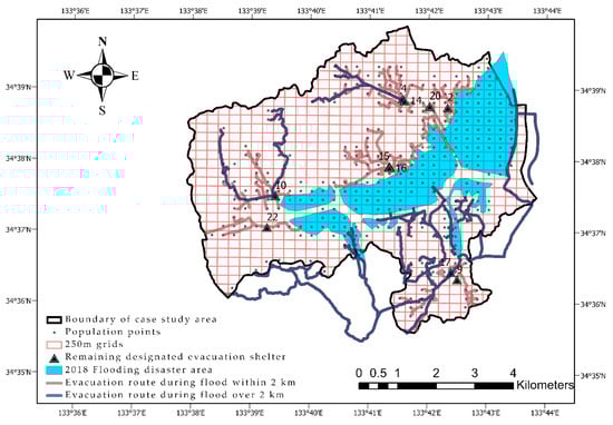Figure 7 shows the evacuation route for the 2018 flooding disaster in the case study area, including the spatial distribution of the population points and designated evacuation shelters. The evacuation distances of less than 2 km and more than 2 km are illustrated in brown and dark blue, respectively. The figure also demonstrates that, of a total of 22 designated evacuation shelters in the study area, after the flood disaster, only 10 shelters remained available and could be accessed along the road network. Furthermore, in the southern and southwestern parts of Mabi, two designated shelters (shelter Numbers 9 and 17) remained available for the residents after the flood. However, due to the long distance of the evacuation routes (more than 2 km), the residents from this area would have had difficulty accessing these shelters.