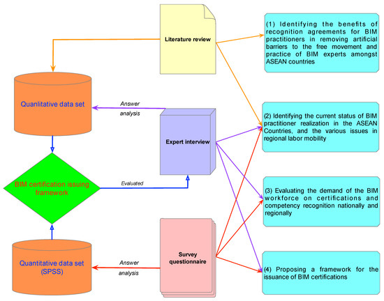 After reviewing the literature and analyzing the experts’ answers, a questionnaire survey was conducted targeting practitioners working in the construction sectors in ASEAN member countries. See Figure 1. This survey collected diverse opinions on BPCs regarding (i) the necessity of legalization of the certification of competency of skilled practitioners of BIM, (ii) granting BIM practice certifications as a supplementation tool for the construction industry, (iii) the conditions for BIM certificate issuance and (iv) other opinions on BPCs. After evaluating 180 completed responses, selected available respondents were contacted for further discussion. All the answers were tested and ranked by the Friedman test and the Wilcoxon signed-rank test. Subsequently, an in-depth expert interview was again used to validate the research results. From these results, a framework for issuing BIM professional certificates was proposed. The research process is summarized in Figure 1.
