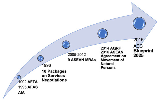 In 1992, the ASEAN Free Trade Area (AFTA) was established as a trade bloc by the Association of Southeast Asian Nations for supporting local trade and manufacturing in all ASEAN countries. To build the ASEAN community, MRAs were signed by nine ASEAN member countries in 2005. The MRAs are agreements among ASEAN member countries that provide mutual recognition of the results of conformity assessments conducted in one member state by authorities in the other ASEAN member states. As of June 2019, there were 3733 engineers on the ASEAN Chartered Professional Engineers Register and 545 architects registered as ASEAN Architects [12]. In 2007, the ASEAN member states’ leaders created their vision for a realization of the ASEAN economic community. The first pillar of the ASEAN Economic Community (AEC) Blueprint 2015 is “a single market and production base”, listing a variety of free-flow policies, including the free flow of skilled labor [2]. In 2016, the ASEAN Agreement on the Movement of Natural Persons was passed, and ASEAN planned the AEC Blueprint 2025. Vision 2020 called for a “free flow of skilled labors and professionals in the region”, including the creation of “ASEAN lanes” at ports of entry to facilitate travel by citizens of member states [5]. The AEC Blueprint 2025 moves the member states towards being more highly integrated and cohesive, competitive, innovative and dynamic, with enhanced connectivity and sectoral cooperation and a more resilient, inclusive and people-oriented, people-centered community integrated with the global economy [3]. The governments in the region acknowledge the importance of mutual recognition and professional mobility [12]. The expectation of skilled labor recognition agreements of BIM experts in ASEAN has also spread more widely. An overview of selected ASEAN agreements related to MRAs is illustrated in Figure 2.
