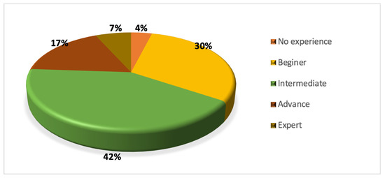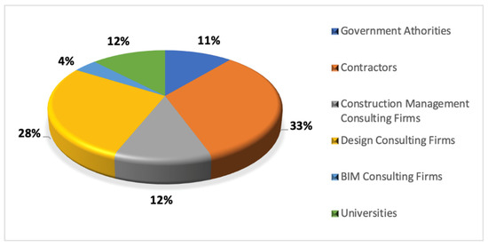 Figure 5 and Figure 6 illustrate the occupations and years of experience of respondents within the construction sector, respectively. The survey collected 180 responses from government authorities, contractors, construction management consulting firms, design consulting firms, BIM consulting firms and universities (Figure 5). Among them, there were 118 (~66%) respondents that had intermediate and above BIM experience, 31 respondents were advanced in BIM and 12 respondents were experts (Figure 6). Additionally, more than half of the respondents noted that they often worked with BIM in their projects. The answers received were evaluated by the Statistical Package for the Social Sciences (SPSS), with the output illustrated in Table 3 and Table 4: Asymp. Sig. p = 0.03. From these results and the respondents’ background information, their consistent answers indicate that the survey results are reliable.