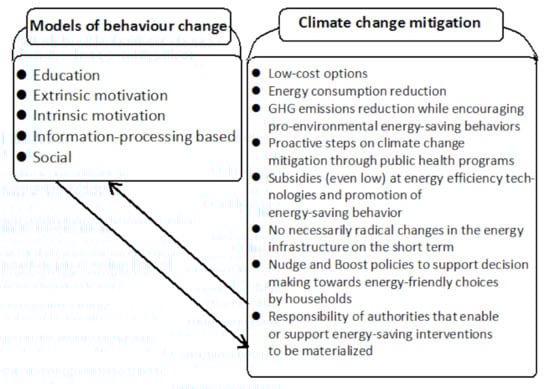 Behavioral interventions related to energy consumption in households are mainly categorized into two categories: (1) one-shot behaviors such as decision-making and expenditure in used appliances, i.e., electricity supply and energy storage appliance, and (2) regular attempts to conserve resources through improvements in everyday behavior, i.e., the operation of appliances, preferred room temperatures, opening window usage patterns, etc. Faber et al. [28] and Van den Berg et al. [35] represented lifestyle change in models, and impact-oriented behaviors were divided into relevant areas used in various modeling techniques (lifestyle changes categorized as “avoid,” “shift,” or “improve”). Curtailment habit behavior, although it can be very difficult to change psychologically and people need strong incentives to do so (such as economic incentives or regulation or education and social campaigns), is low-cost behavior to adopt [36]. Many of the solutions exist at the level of the individual or household and rely directly on changing patterns of a household’s consumption. Other researchers refer to individual actions such as “behavioral wedges” of a larger set of necessary actions to reduce GHG emissions [32] or provide specific patterns of behavior change [27,37]. A distinction needs to be made between interventions (activities aimed at changing behavior) and policies (actions of responsible authorities that enable or support interventions) [37]. In Table 2, policies and interventions in household’s behavioral change in climate change mitigation are distinguished. It is important that being aware of the threat of climate change, and especially from a health perspective, can help to change household’s behavior. The impact of climate change on human health has been identified as one of the greatest challenges to address climate change mitigation failures. Defining climate change in terms of public health can make climate change more personal [38,39]. Co-benefits for health occur where a program or action that specifically addresses prevention often produces health benefits. Scholars have also proposed using health co-benefits of climate-friendly action as an opportunity to take significant climate change mitigation steps [36,40,41]. Amelung et al. [42] conducted an investigation and stated that European households should be more inclined to take preventive action after receiving additional information about their health benefits, whether others are taking it or not.