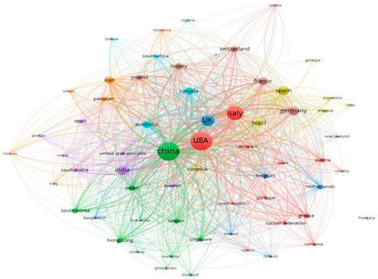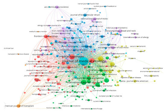 Literature data were collected from the SCOPUS database by restricting the search to all published documents from 1 January, 2019 to 24 June, 2020 under the keywords “SARS-CoV-2” AND “Transmission Route” OR “Genomic Map” OR “Pathogenicity” OR “Symptoms” OR “Therapeutics” OR “Survival” OR “Environment”, from which 2000 documents were obtained. The bibliometric analysis used various bibliometric ranking indices, including the top journals, countries, and the most frequent keywords in the obtained documents. The worldwide distribution of documents was used to clarify the connections and relationships between terms, keywords, and countries as well as to establish a rainbow density map of bibliographic coupling and countries of publication in this area, as presented in Figure 1, Figure 2 and Figure 3. In the current review, the top countries are shown in the bibliometric map of the published documents and their links among countries (Figure 1). A circle’s size indicates a country’s number of publications, while the color of the circle refers to the utilized keywords. In the same sense, the connected lines between countries express the citations and the link strengths between the publications of each country. It was noted that most research conducted on SARS-CoV-2 was performed in the USA, followed by China and Italy. The Journal of Medical Virology and Journal of Medical Hypotheses were the top journals that published high numbers of SARS-CoV-2 articles (Figure 2). The articles addressed the infection among females, the isolation and purification of the virus for further studies, genetic mapping, and the symptoms of the infections, such as fever (Figure 3).