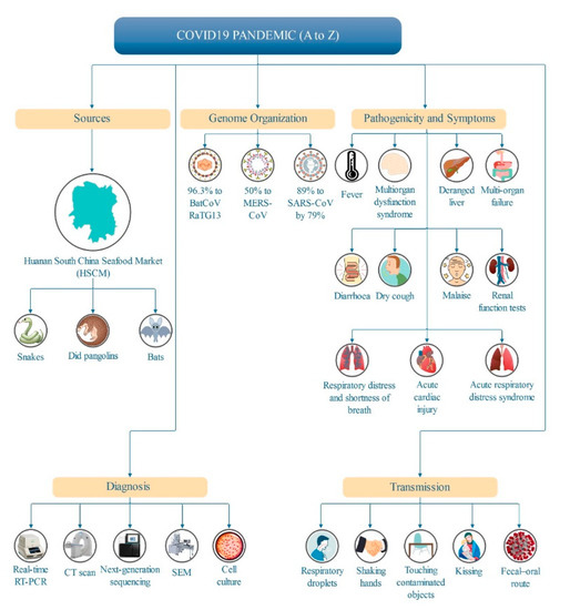 The genus of coronavirus is composed of at least three genetically and antigenically distinct groups of CoV that cause mild to severe enteric, respiratory, or systemic disease in domestic and wild animals, poultry, rodents, and carnivores, as well as mild colds in humans. SARS-CoV-2, from the genus of coronavirus, is an enveloped and positive-sense virus with single-stranded RNA. However, SARS-CoV-2 has a high potential to cause respiratory or systemic illnesses in humans. The zoonotic transmission of this virus has been reported in several regions, including a severe acute respiratory syndrome CoV (SARS-CoV) infection, which was transmitted from bats and the Himalayan palm civet (Paguma larvata) in 2002–2003 in China, and the Middle East respiratory syndrome CoV (MERS-CoV), which has been transmitted from dromedary camels (Camelus dromedaries) in the Arabian Peninsula since 2012. SARS-CoV-2 causes self-limiting upper- and lower-respiratory infections in people with immunocompetence. It has been detected that SARS-CoV-2 has 89% similarity in the nucleotide sequences to bat SARS-like-CoVZXC21, while it has 82% similarity to the human SARS-CoV genome [1,2,3].