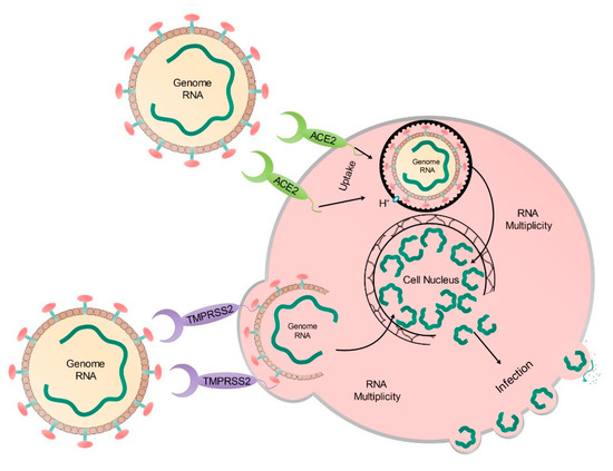 The life cycle of the virus is presented in Figure 5. The virus enters into the cell cytoplasm through the ACE2 receptors available on the surface of the human cells. The virus genome is multiplied inside the cells and each of the new genomes is enveloped by the cell membrane and then released to infect a new cell.