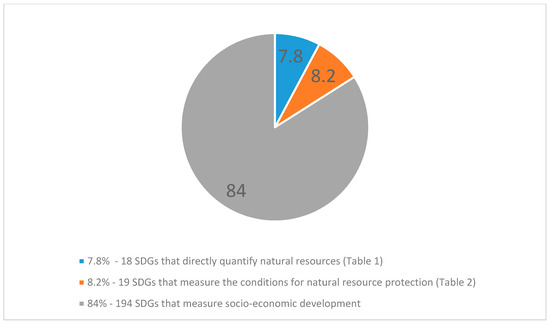 This paper goes beyond goals and targets to the indictor methods themselves, from which it is possible to record a total of 30 targets and 37 indicators (Table 1 and Table 2), comprising methods directly quantifying natural resources (18 indicators, 7.8% of total—Figure 1) or providing supporting conditions for natural resource protection (19 indicators, 8,2% of total). These constitute a small percentage compared to the balance of the indicators that are focused on socio-economic and governance issues (84% of total—Figure 1). These results are similar to those produced by Wackernagel et al. [19], who relied on a draft list of indicators and argued that they were dominated by indicators related to social development, while those related to resource security receive substantially less attention. This does not mean, however, that these are not sufficient as, in theory, a few comprehensive natural resource indicators could provide adequate information for management to ensure sustainability. By contrast, the Convention on Biological Diversity (CBD 2020) [39] has drafted a list of some 161 indicators for monitoring of biodiversity issues alone, which themselves have been challenged as inadequate, suggesting that the SDG attempts to be brief may be limiting.
