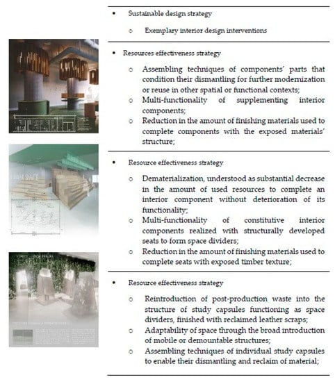 The interconnectedness of the natural and built environment components is seen as an essential design environmental-responsibility indicator of an interior and its components. Design interventions, oriented toward the control over building materials and product consumption level, are crucial for the creation of sustainable interior components. The most effective and technically affordable methods to fulfill this demand, embedded in the concept of DfREI and executed in the students’ design projects, combined the following: (1) Design for direct control and reduction of resource consumption; (2) Design for deconstruction and disassembly [45] adjusted to the formation and scale of interior constitutive components; (3) Design for direct reuse or adaptive reuse, exercised within the interior design discipline, in intra- as well as inter-setting contexts; (4) Design for repair and upgrading services; (5) Design for recyclability, and with the usage of recycled building materials.