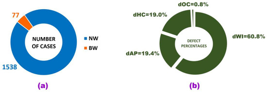 Numbers of cases in the research (a) and percentages by types of defects (b).