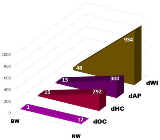 Figure 2a shows the number of cases by type of element. Normal windows amount to 95% of the total (NW = 1538 cases), while bay windows constitute the remaining 5% (BW = 77 cases). In turn, Figure 2b represents the percentage distribution according to the types of defects, it being shown that 6 out of every 10 cases belong to ‘water infiltrations’ (dWI = 60.8%). The following defects—‘air permeability’ (dAP) and ‘humidities by condensation’ (dHC)—are practically the same.