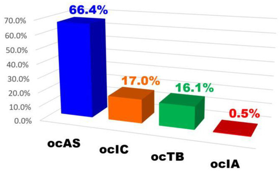 As indicated in the methodology section, four different types of originating causes were found in this research. It can be noted that the ‘absence/deficiency of sealant’ occurs practically 2/3 of the time (ocAS = 66.4%). The second position (ocIC = inadequate construction material and/or placement) and the third position (ocTB = existence of thermal bridges) have quite similar values, differing by less than one percentage point.