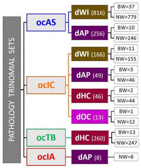 The most frequent trinomial set is ‘absence/deficiency of sealant’ that leads to ‘water infiltrations’ in ‘normal windows’ (ocAS-dWI-NW = 779). It is followed in second place by the ‘existence of thermal bridges’ that leads to ‘humidity by condensation’ in ‘normal windows’ (ocTB-dHC-NW = 247). In third place is the ‘absence/deficiency of sealant’ that leads to ‘air permeability’ in ‘normal windows’ (ocAS-dAP-NW = 246). The fourth position is held by ‘inadequate construction material and/or placement’ that leads to ‘water infiltrations’ in ‘normal windows’ (ocIC-dWI-NW = 155).