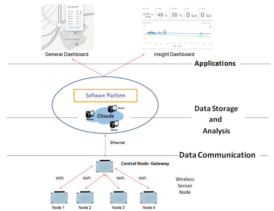 Wireless sensor networks are one of these innovative tools which have been developed for monitoring the environment, capturing data with a high quality and an affordable cost for urban areas managers [28]. A wireless acoustic sensor network is composed of a set of nodes [29] which are deployed in the area of interest to continuously monitor, collect and analyze acoustic parameters values for long periods of time. WASNs can be classified in two categories depending on their nodes spatial location: fixed [23] or mobile [30] stations, that includes the mobile participatory measurement networks like smartphones. Wireless communication technologies add to the devices an ease of deployment and the ability to capture data in near real-time, store and obtain big data statistics [31] and also create dynamic noise maps [32]. Moreover, long-term monitoring of sources of noise pollution is important for the understanding of how these sounds evolve with time, in order to control and prevent them [29].