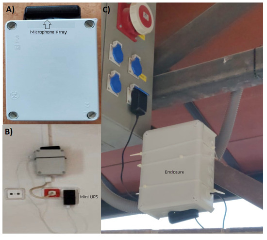 Detail pictures of the deployed devices. (A) External appearance of the device. Raspberry Pi and the other components are inside a protected box. At the upper part of the box, microphone array can be observed, (B) installation of the device (indoor), (C) installation of the device (outdoor).