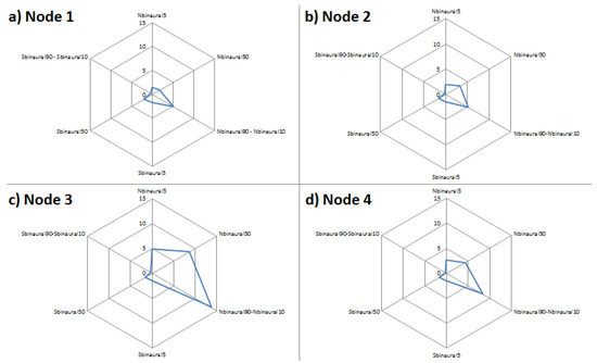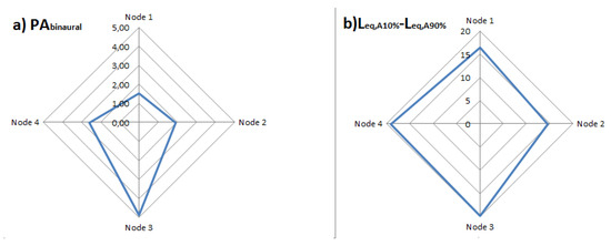 To analyze the importance of each parameter in the annoyance, a set of radial graphs is shown in Figure 5 with the values of percentiles for binaural loudness and binaural sharpness. Node 3 values in Figure 5c present the higher values in and showing the relevance in a direct correlation with [56]. A lower values of in node 4 is related with a lower . Percentile values for binaural sharpness don’t show clear correlation with in this case. As a recommendation to improve the acoustic sustainability of this zones, actions should be taken to decrease maximum noise levels and to create a soundscape with sound sources that present lower level variability.