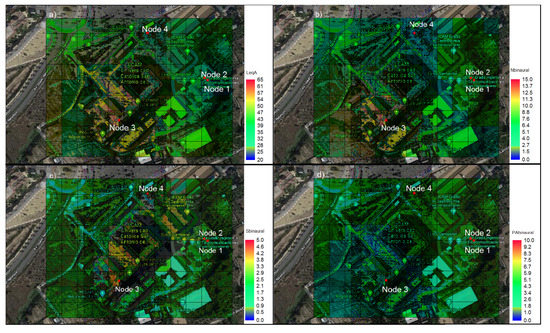 Noise map obtained applying Kriging spatial interpolation technique to AV values in Table 3. (a) , (b) , (c) and (d) .