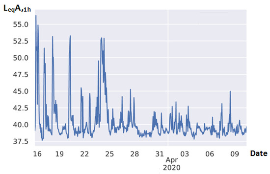 Next, a more in-depth study of the outdoor acoustic node 4 is presented. In this location, it can be observed the natural soundscape of the campus over a long-term measurement. First, it is graphed in Figure 7 the variation of values, with an integration period of 1 h, from 15th of March 2020 to 15th of April 2020. This graph shows the evolution of the sound pressure level during the first weeks of the state of emergency period. The first dates correspond to the beginning of emergency, being these first days a week of transit to full state of emergency. It is important to note that days 20th, 23th and 24th of March 2020 were days with heavy rain events, so a period of high noise levels appears. After those dates, a reduction in sound levels of about 10 dB is observed until the levels are stabilized in the state of emergency period, as it is studied in details below.