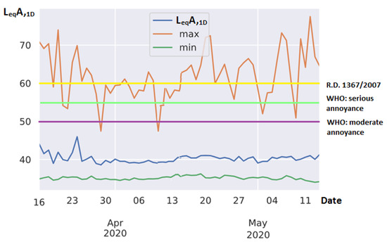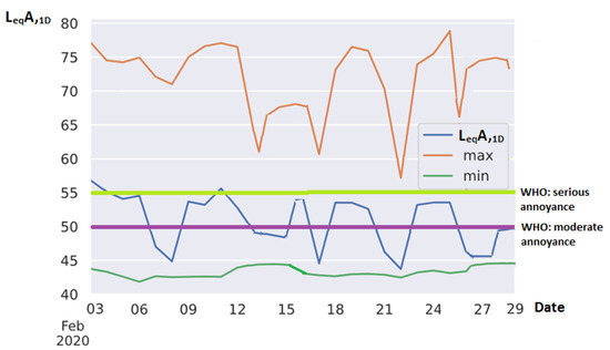 Figure 11 shows values together with maximum and minimum values, with an integration period of 1 day, at node 3 during February 2020. It can be observed that values are lower than 55 dBA, which is the recommended level for serious annoyance from WHO.