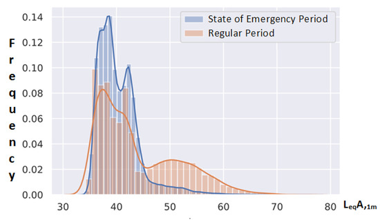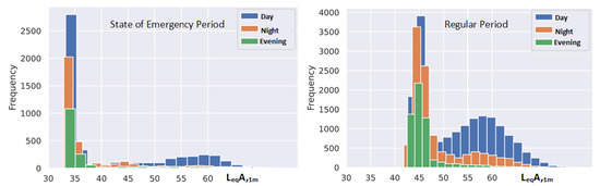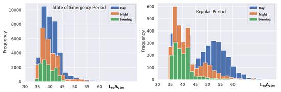 In order to analyze in details the sound level distributions along a day, it has been divided the entire day in three different time intervals [51]. Long-term average noise levels are defined as: day interval corresponds from 6 to 18 h, evening interval from 18 to 22 h and night interval from 22 to 6 h. Figure 10 shows several frequency distribution graphs for both state of emergency and regular periods for the previously defined time intervals.
