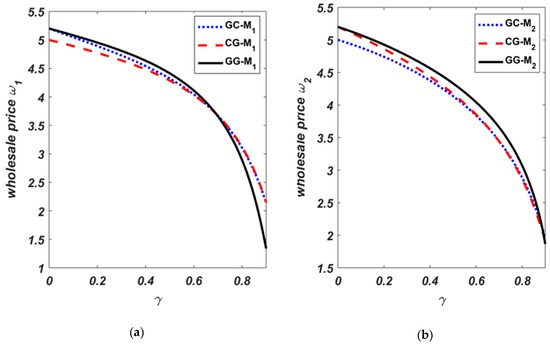 Because the calculation in the GG decision scenario is too complex, it is impossible to directly discuss the parameters as above. In this regard, a numerical simulation experiment method is introduced for this comparison. According to the research in the literature [23,41,42], we set the parameter values , , and for the numerical example to observe the influence of competition between supply chains on the wholesale prices.